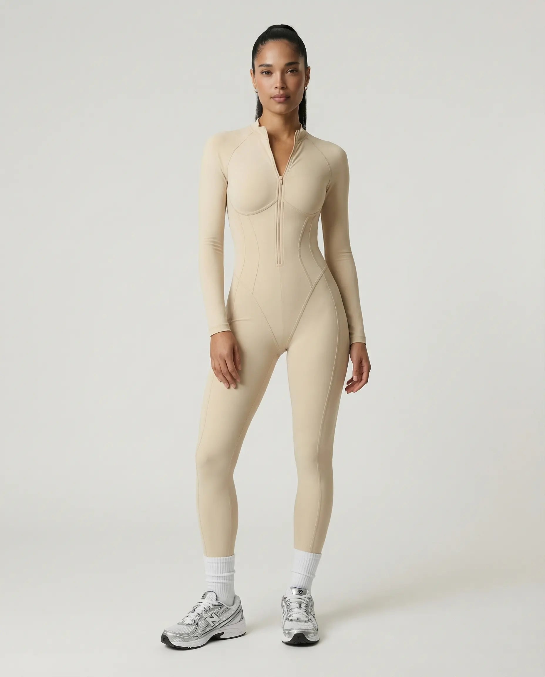 Seen sculpted second skin jumpsuit for women, cream-colored one-piece with stretchy fabric, form-fitting and sleek.