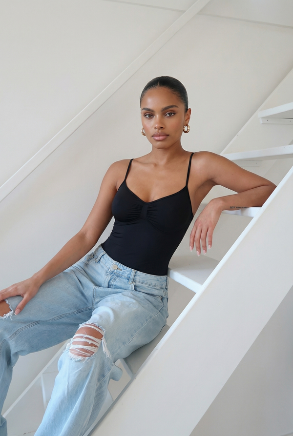 Crafted from a flexible nylon and elastane blend, the fabric feels soft and breathable with reliable stretch and shape retention. Suitable for year-round wear, this bodysuit works seamlessly on its own or layered under tailored pieces, knitwear, or relaxed silhouettes.